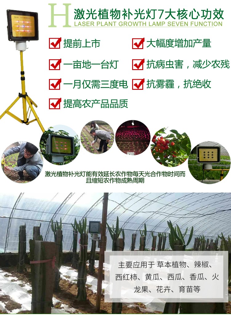 激光植物生长灯是采用了激光合成植物光合作用光谱技术,研制的用于促进植物光合作用的植物生长灯!激光植物生长灯具有向绿色植物提供有效光照的功能,时间可任意设定,可延长植物每天光合作用有效时间, 尤其对于阴雨天、雾霾天可使植物正常生长,也可应用于育苗工厂和植物工厂,目前是光伏农业中解决光伏和农业争光问题的较好方案。