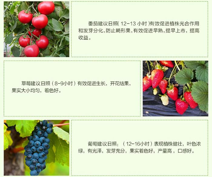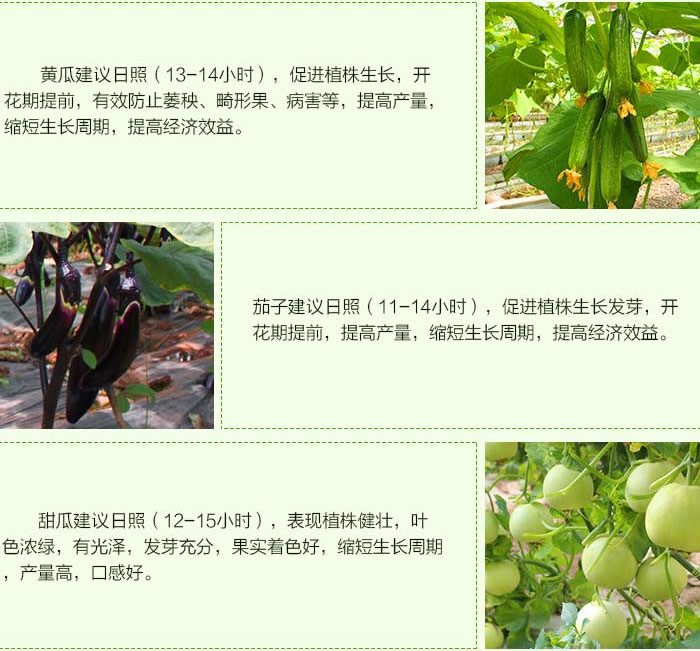 植物生长需要光合作用,但光合作用需要温度、水、叶绿素、CO2(气体),北方蔬菜大棚晴天光照一般不足8小时,又16小时在休眠,停止生长,还在消耗营养。而有些菜农认为又8小时光照就够了,这是错误认识,因为大棚蔬菜一般都是中日照和长日照植物,光照时间都需要11-13小时或13-16小时才能正常发育生长。光照时间短,延迟开花结果,延长生长期,抗病虫害能力差,降低产量或经济收入。大棚补光灯